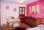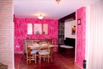 El salón cuenta con un sofá, un televisor y una chimenea, que hace más confortable la estancia en la casa rural, sobre todo en épocas de baja temperatura. En las paredes del salón, se pueden apreciar dos rectángulos de piedra antigua, y en el techo, se mantienen las vigas de madera. A la espalda del mismo, se encuentra el comedor, con sus sillas y mesas de madera color canela oscuro, y rodeado de la pintoresca pared pintada de un rosa saltón, que da mucha alegría a la casa rural.